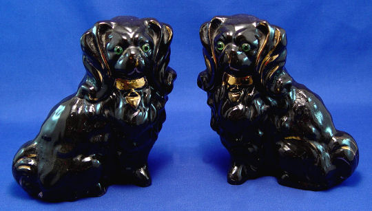 PAIR OF HIGH GLOSS BLACK STAFFORDSHIRE DOGS: Green glass eyes, gold accents, 7 1/2''h.