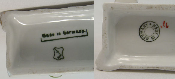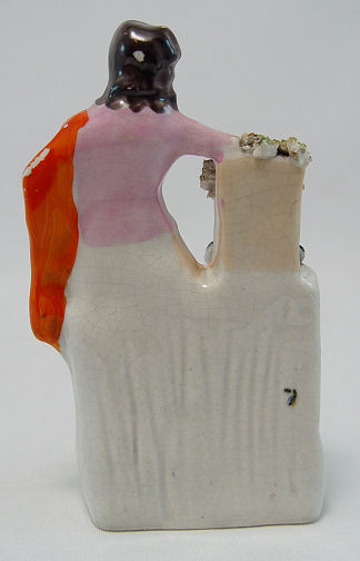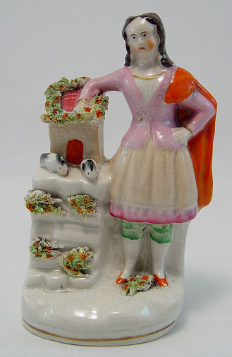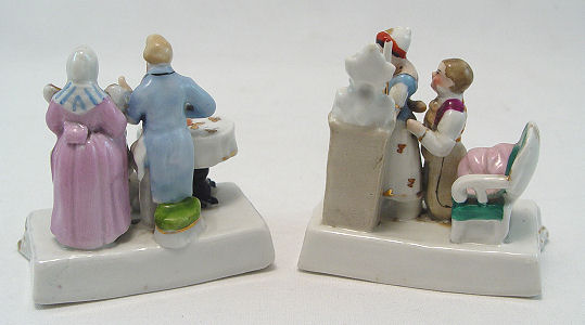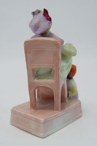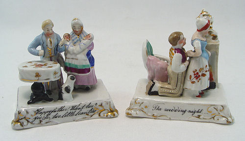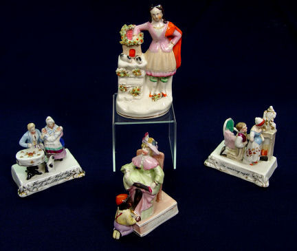 FAIRINGS AND STAFFORDSHIRE FIGURE: 4 piece group to include 2 German made fairings- ''The Wedding Night'' and ''Happy Father What Two?'', each approx. 3 1/2''h. The Staffordshire figure is of girl with rabbits, 5 1/2''h. Included in this lot is a German figure of a woman and shoe shine boy.