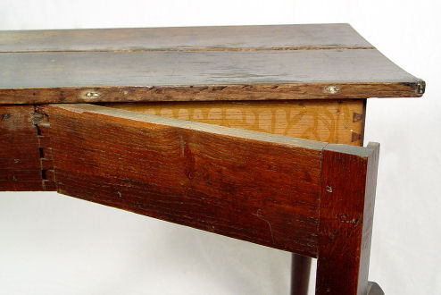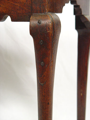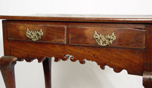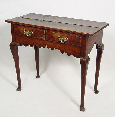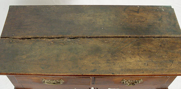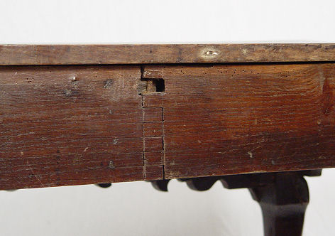 PERIOD QUEEN ANNE TABLE: 28 1/8'' h. x 33 3/4'' x 15 1/4''. Pad foot, missing top half of flip top, split to remaining surface.