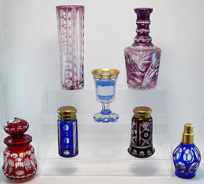 7 PIECE COLLECTION OF BOHEMIAN CUT TO CLEAR GLASS: Amethyst, ruby, and cobalt. To include a 10'' vase, water decanter, 2 sugar shakers, a covered jar, a bottle, and a commemorative beaker from Johannes. Tallest piece is the amethyst vase at 10''h.