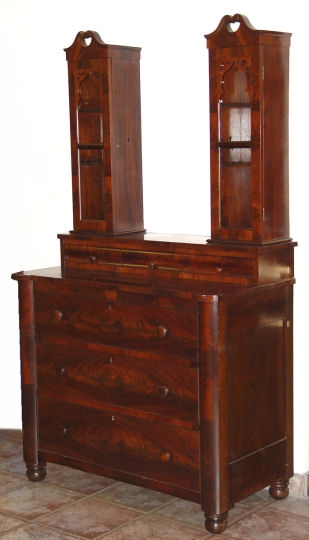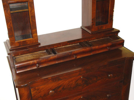 19TH C CROTCH GRAIN MAHOGANY CHEST WITH CURIO COLUMNS: 3 drawer chest on bun feet, upper section comprised of glass front twin columns and a row of three small drawers. 34''h, the cabinets add an additional 38'' x 40 1/2'' x 19 3/4''.
