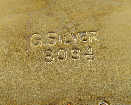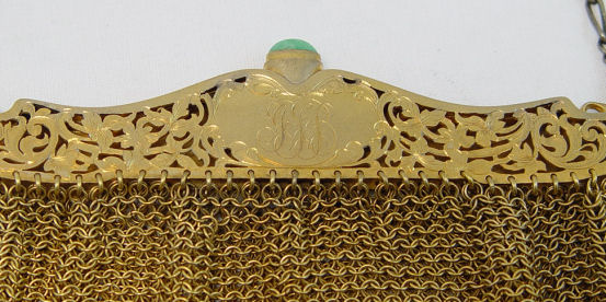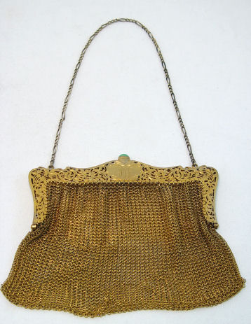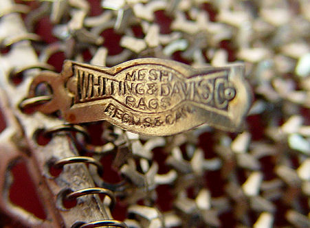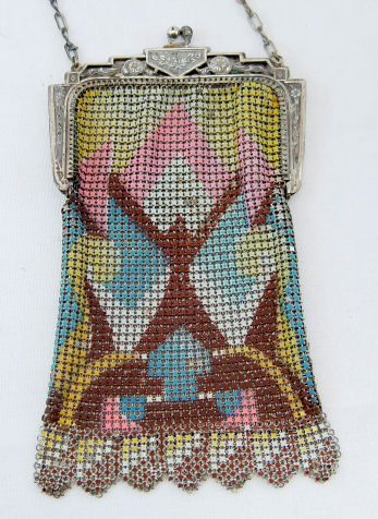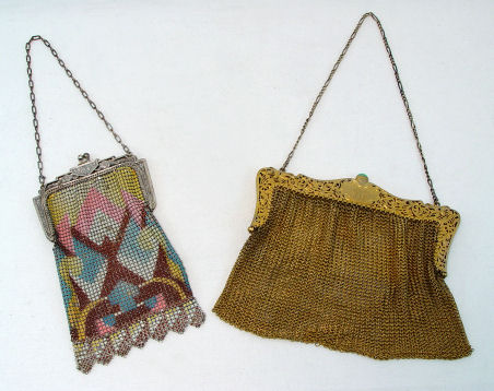 ART DECO ENAMEL WHITING & DAVIS MESH PURSE AND A GERMAN SILVER MESH PURSE: The German purse has a green stone clasp, filigree metal frame, 6 1/2''x 6''. Whiting & Davis purse bears the nameplate, bold geometric pattern, filigree clasp, 7'' x 4''. Measurements exclude the chain handles.