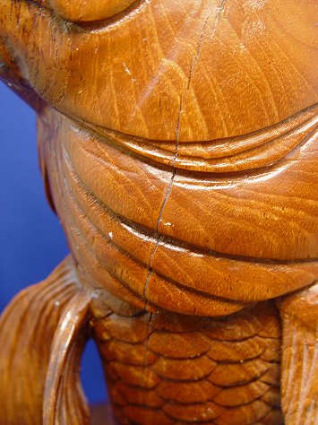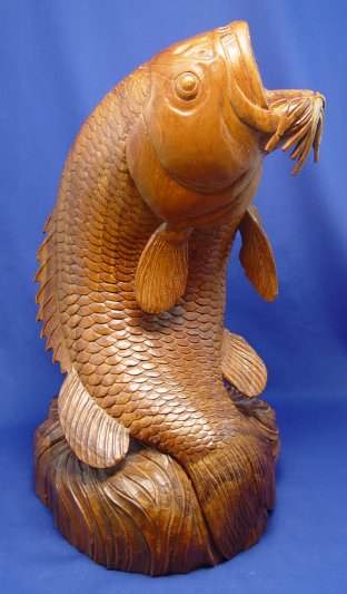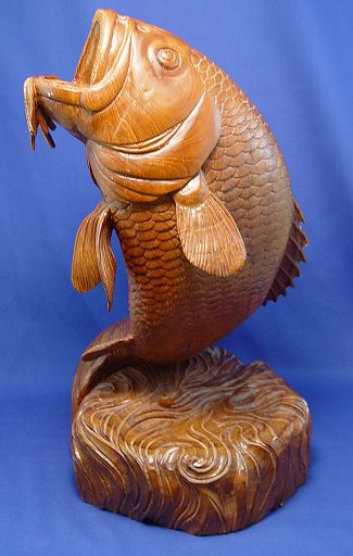 LARGE HAND CARVED WOOD FISH: Fine contemporary carving, the one that can't get away. 20''h., the base is 11''.