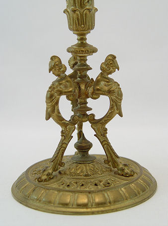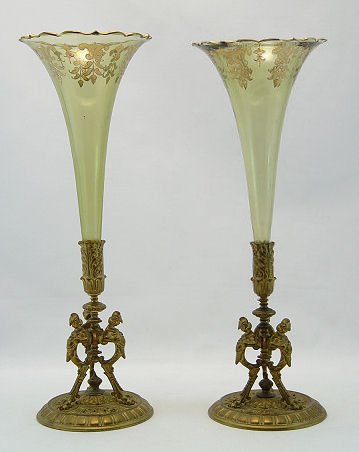 PAIR OF GILT MOUNTED ENAMELED GLASS TRUMPET VASES: The glass fits securely in the figural bases. Scalloped rim, hand enameled decoration. Minor chips to glass.