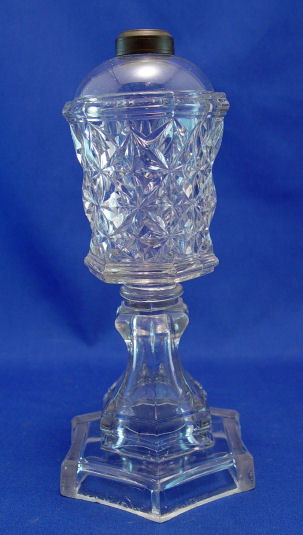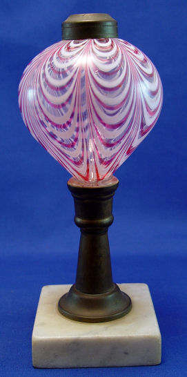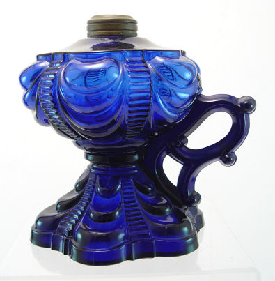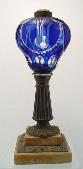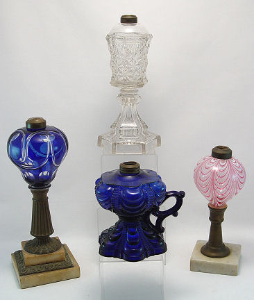 GROUP OF 4 PERIOD OIL LAMPS: Starting with the two believed to be Sandwich Glass- Cobalt overlay cut to clear font, brass stem, double marble base. The other Sandwich lamp has cranberry and white loopings, brass stem and marble base, 9 1/2''h. These two lamps are sold with a cobalt glass Coolidge Drape finger lamp, 5 3/4''h ( dent in the collar) and a 10'' whale oil lamp (chips on underside of base).