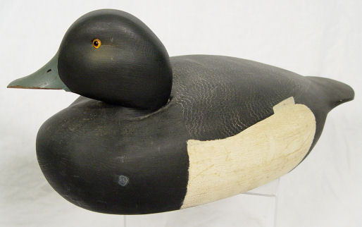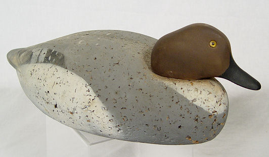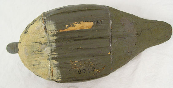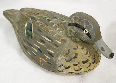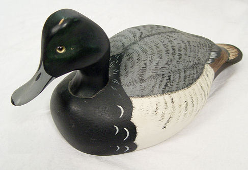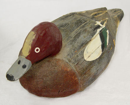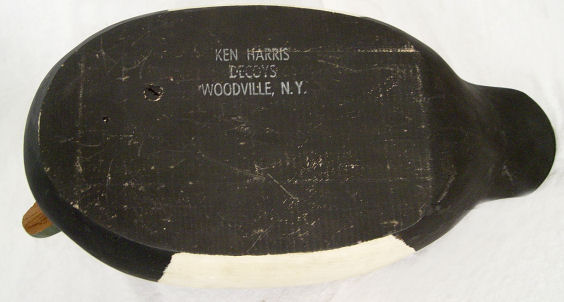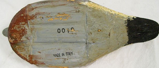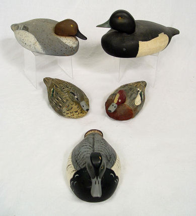 5 DUCK DECOYS: Includes a wooden duck signed Ken Harris Decoys, Woodville, N.Y. , glass eyes 16 1/2'' l. and 7'' h., A Jon Don duck, 12 1/2'' l. and 6 1/4'' h. made from wood and has glass eyes signed under the beak ''Jon Don'', a large unsigned duck made from cork, with glass eyes 16 1/2'' and 6 5/8'' h.. Also included are 2 small decorative ducks marked Made In Italy.