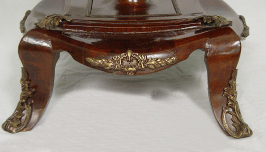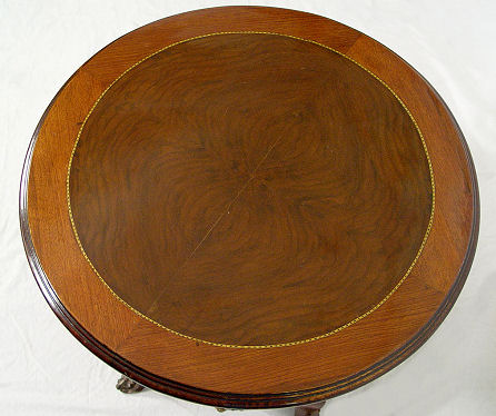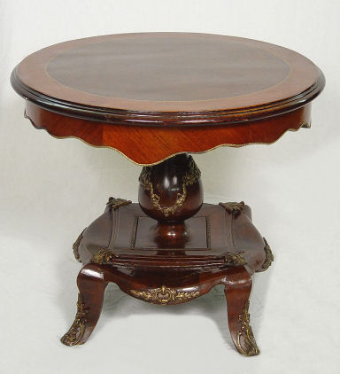 MAHOGANY ORMOLU SIDE TABLE: Round table with shaped apron, applied ormolu to pedestal and legs. 20th C. 22 1/2'' h. x 26'' dia.
