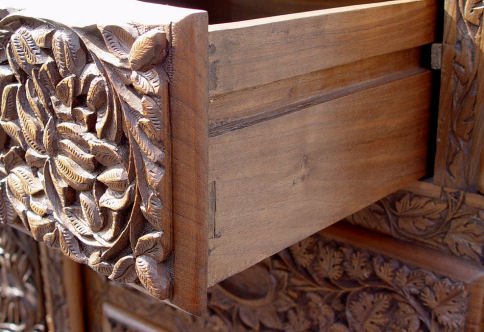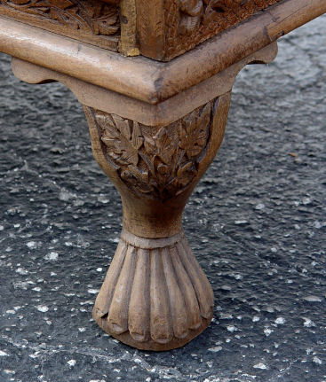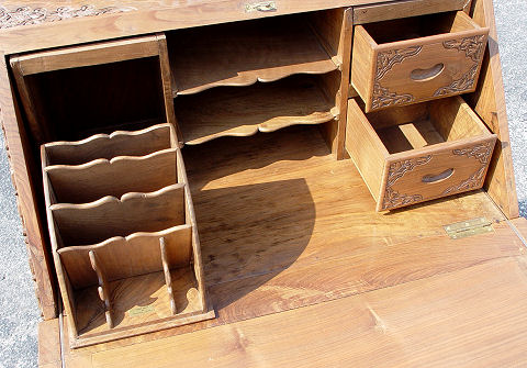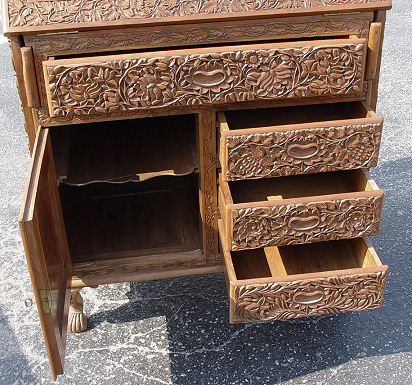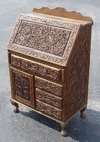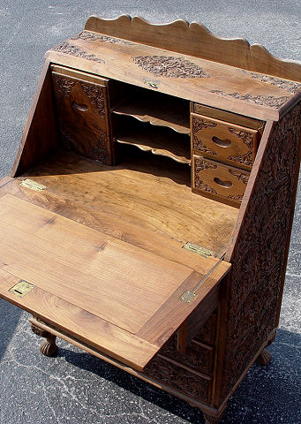 HEAVILY CARVED TEAKWOOD SLANT FRONT DESK: Compartmented interior with letter rack, shelves and drawers. 47''h x 29 3/4'' x 16''