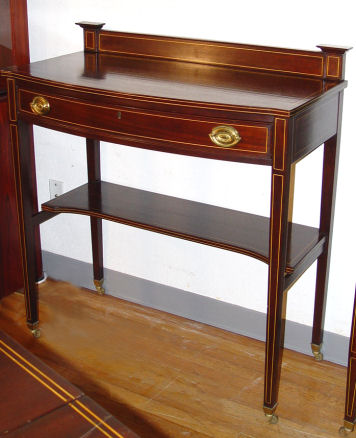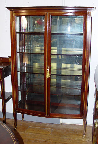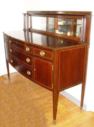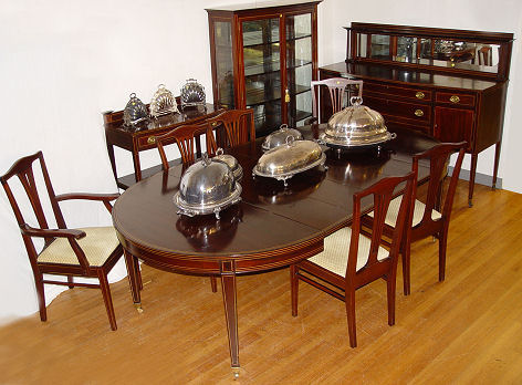 EARLY 20TH C HEPPLEWHITE STYLE DINING SUITE: 10 piece set to include TABLE with 4 leaves, 6 CHAIRS, CHINA CABINET, SIDEBOARD, and SERVER. Round table 54''dia, extends to 98'' with four leaves 11'' each with storage crate; of the six chairs two with arms; 3 bowfront side pieces - Sideboard with 15''h. mirrored backsplash 39 1/2''h. x 66''w. x 24''deep at center 21'' at ends, three drawers to center flanked by single drawer over door; Server with single drawer over open lower shelf, 39 1/4''h. including small backsplash, 36''w., 18''d at center; China Cabinet with glass doors and side lights, mirrored back with 4 wooden shelves, 65 1/4''h. x 42 1/2''w. x 17''d at center. Tapered legs to all pieces. Of the set only the 6 chair legs do not end in brass caps with castors. Est. $4000/6000**