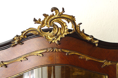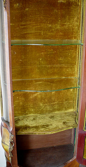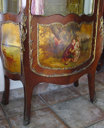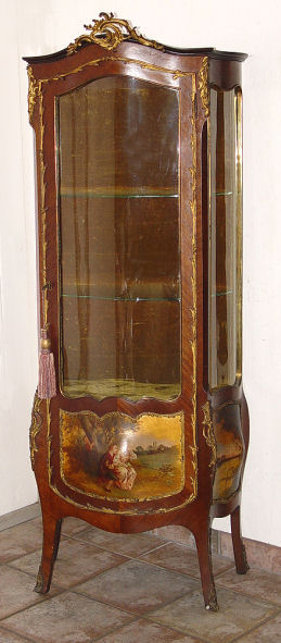 FRENCH VERNI MARTIN LOUIS XVI STYLE VITRINE: Early 20th C French display cabinet featuring hand painted scenic panels, serpentine glass, and rich in ormolu. Velvet back interior, shaped glass shelves along with a velvet covered shelf. 68''h. x 27''w. x 16'' Est. $2500/3000**