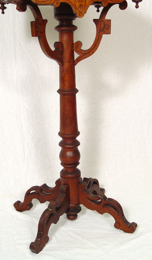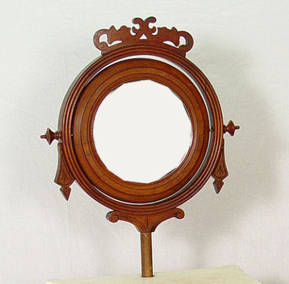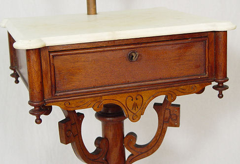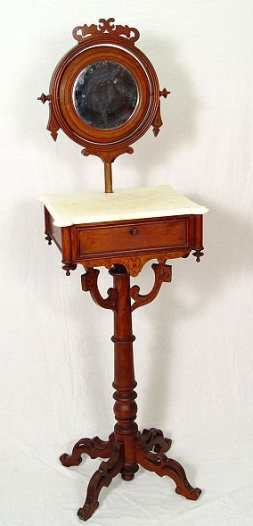 VICTORIAN MARBLE TOP SHAVING STAND WITH MIRROR: Tall one drawer stand on pedestal base, cookie corner white marble top under the round mirror. The mirror adjusts in height. 41'' h. stand, 63 3/4'' h. overall with mirror. top is 18'' x 16 1/2''.