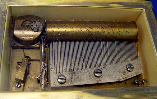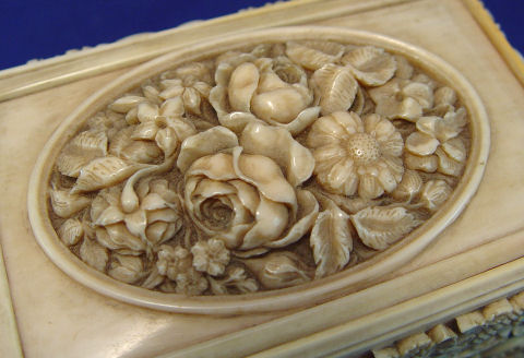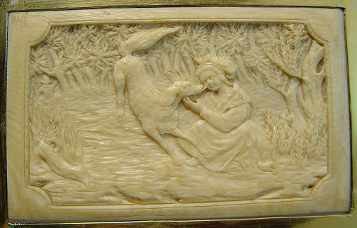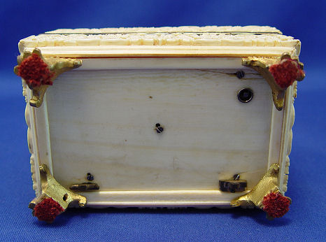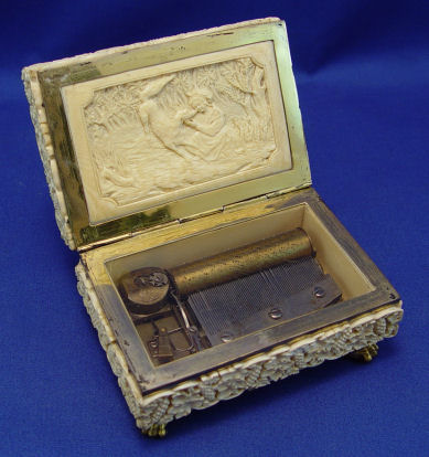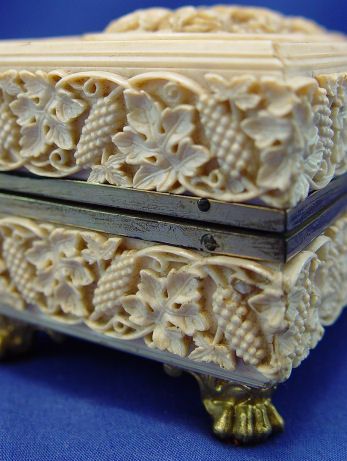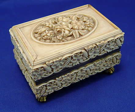 RICHLY CARVED IVORY MUSIC BOX: Exterior is carved in a floral and grapevine design, under the hinged lid is a carved panel of a girl with hound dog. 2 1/2'' x 4 1/2'' x 3''. Music is in working order. Ormolu paw feet.