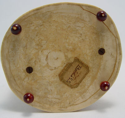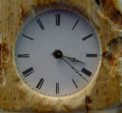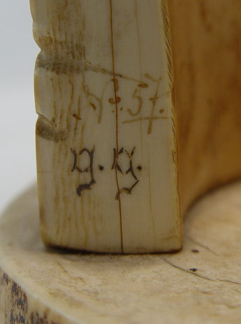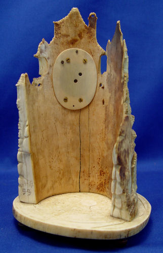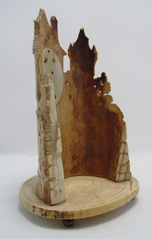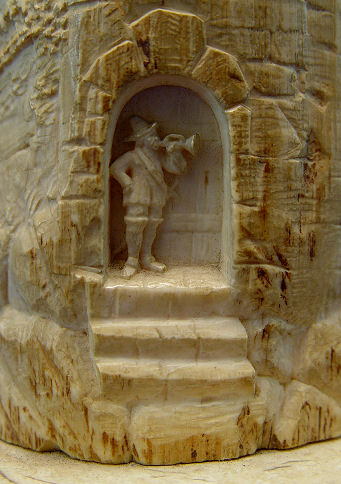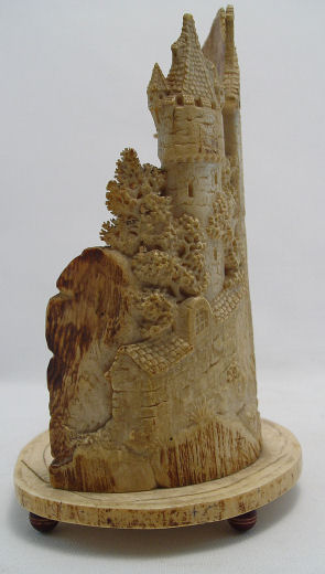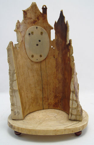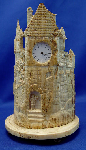 EUROPEAN CARVED IVORY CLOCK TOWER: Carved from a tusk, in the form of an alpine scene with figure, signed GG. 8'' h, the base is 5 1/4'' dia. The clock is key wind and is working order.