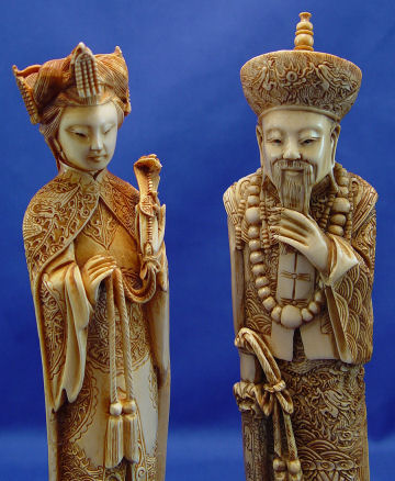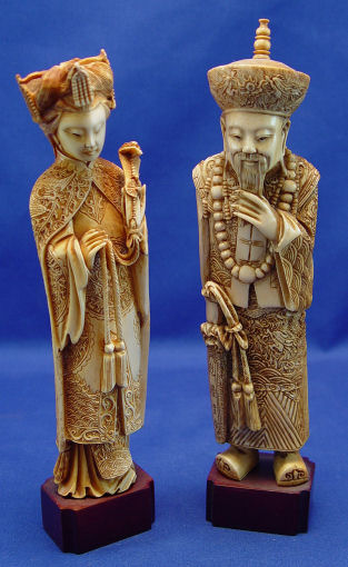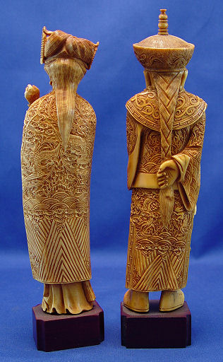 CARVED IVORY EMPEROR & EMPRESS: Highly detailed costumes and features. 8-8 1/2''tall excluding the wooden bases.