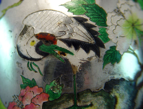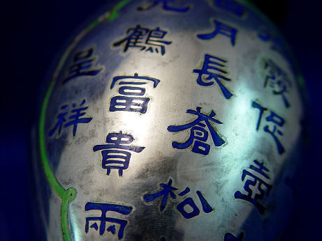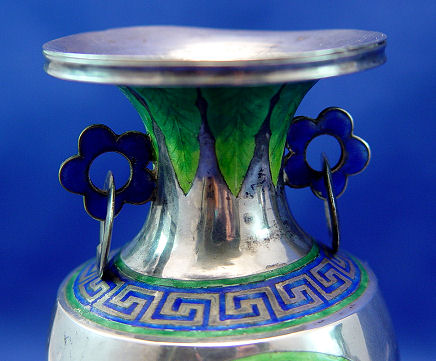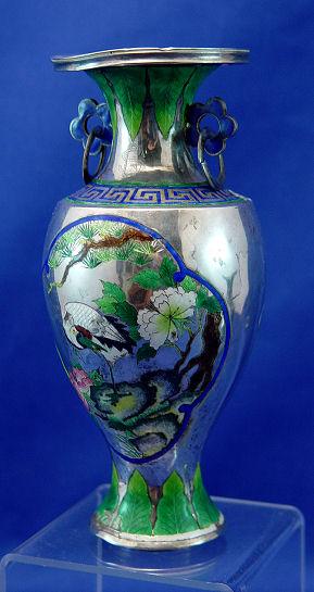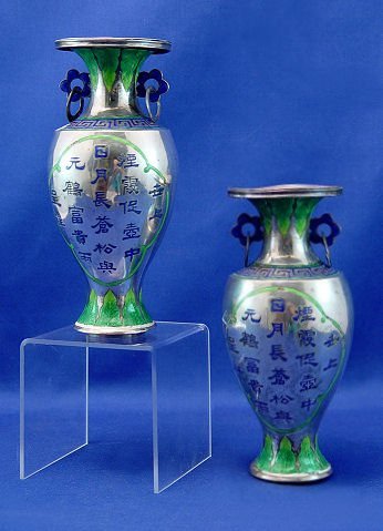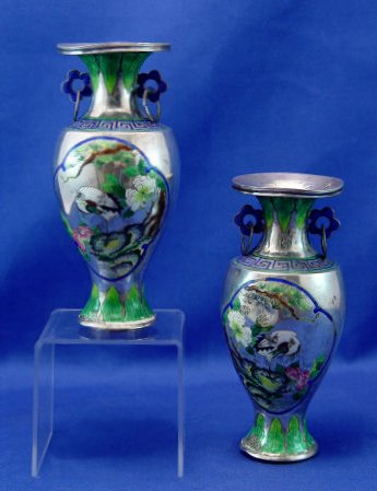 JAPANESE ENAMELED SILVER VASES: Cloisonne and enamel decoration on silver, signed on the underside. 6 1/4''h. Please call for condition.