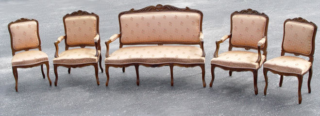 5 PC FRENCH VICTORIAN PARLOR SUITE: Comprising 1 open arm settee, 2 open arm side chairs and 2 armless side chairs. Richly carved crest rails and beautifully upholstered. Ready for your home or shop.