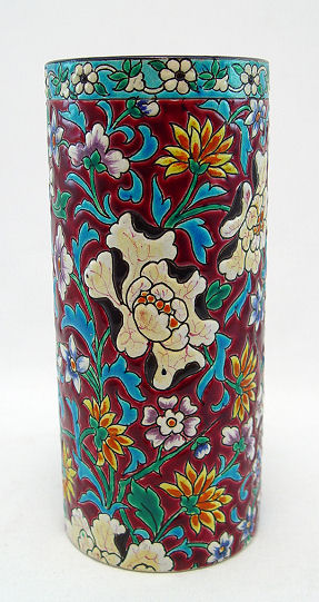 LONGWY FRENCH POTTERY VASE: Cylindrical form, floral decor, 7'h, 3'' dia. Faint Longwy impression.