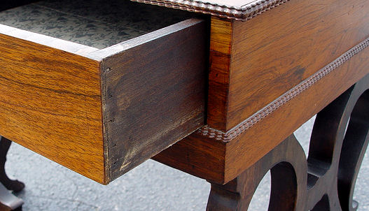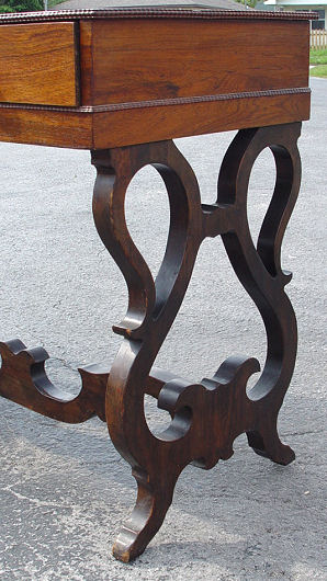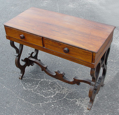 VICTORIAN 2 DRAWER ROSEWOOD SIDE TABLE: Scrolling side supports as legs, shaped stretcher, 2 drawers. 28 3/4'' h. x 38'' l. x 18'' d.