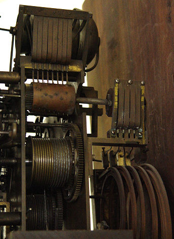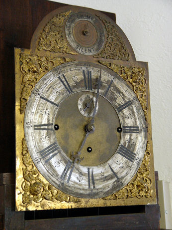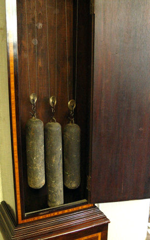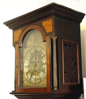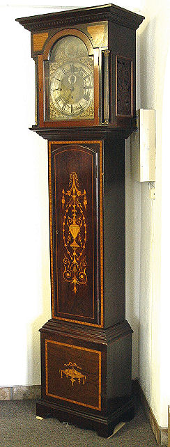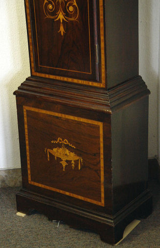 BECANCON FRENCH MARQUETRY INLAID ROSEWOOD EIGHT BELL TALL CASE CLOCK CA. 1840: Weight driven, gong and bell strike. Marquetry inlay case door, the dial is worn brass with filagree cherub heads at the corners. 87''h x 19 ½''x 10''.