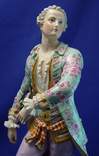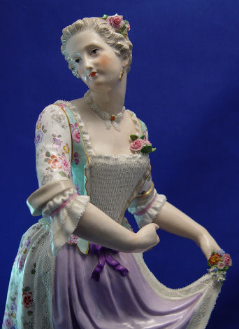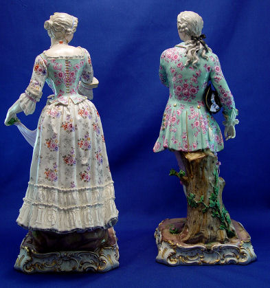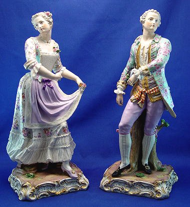 PR OF EXTRAORDINARILY LARGE MEISSEN FIGURES: With exquisite attention to detail, especially the lace bodice and trim to the dress. Excellent condition save for some leaf tip loss. 18 1/2''h., cross sword marks under glaze.