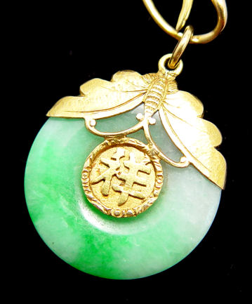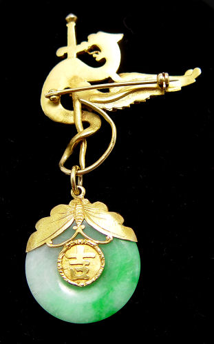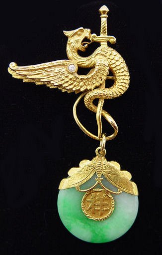 14K GOLD & DIAMOND DRAGON PIN WITH MOTH AND JADE RING CHARM: Whimsical brooch with dragon wrapped around a sword over the charm, pendant or watch loop currently supporting a gold moth and variegated green jade ring centered by a gold disk with character marks to each side, 3''h, 19 grams overall. Please note hair line separation in gold along front wing.