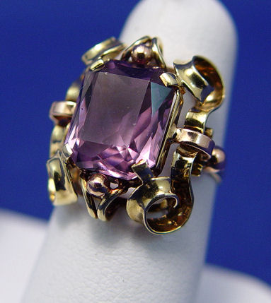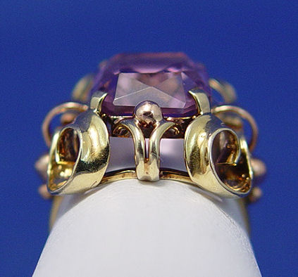BRITISH AMETHYST ROSE GOLD RING: 6ct amethyst in an emerald cut, set in an elaborate scrolling mount of 14k yellow and rose gold, marked 585 maker mark of flower? W LX, size 6, 5grams. Est. $400/600**
