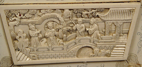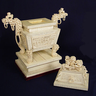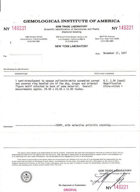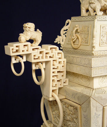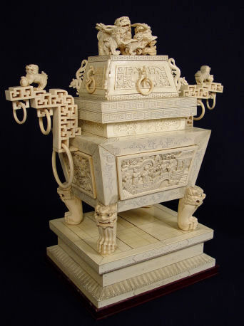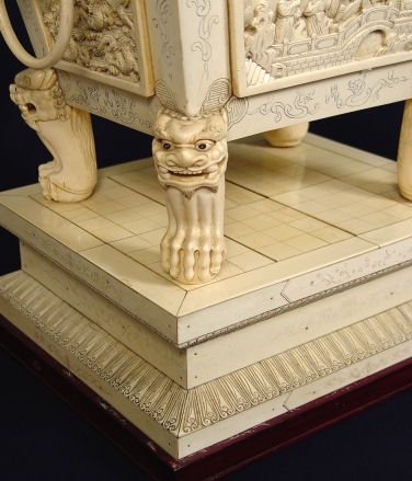 PALATIAL CARVED IVORY RING HANDLED URN: The urn is carved, assembled and covered in ivory. Foo dog, dragon and oriental figure motif with carved scenic panels, lions heads and claw feet, ring handles. All surmounted with foo dog figures. 24 1/2''h. x 23 1/2'' x 11''. Sold with the 1977 Gemological Institute of America Gem Trade laboratory report.