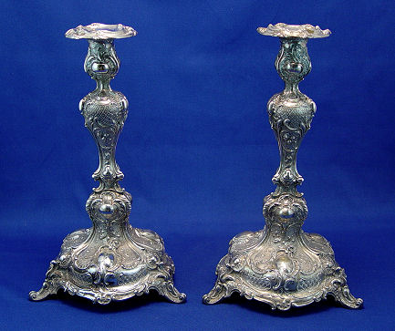ORNATE PAIR OF GERMAN FINE 800 SILVER CANDLESTICKS: Repousse floral, foliate and scroll design, scrolled feet. Struck with the crescent, crown 800 mark. 12''h. Approx. 28.5 oz. total.