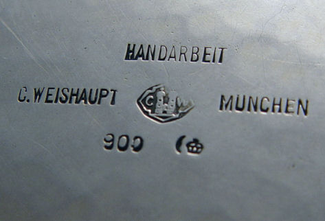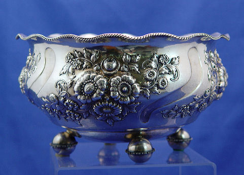 FINE 900 GERMAN SILVER REPOUSSE BOWL: Hammered and floral repousse bowl on ball feet. The ruffle rim is trimmed in a rope type border. 9'' dia. 5''h. Hallmarked with the German crown and moon, the retailer, city mark? and Munchen. Approx. 18.75 oz.
