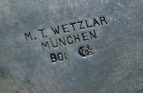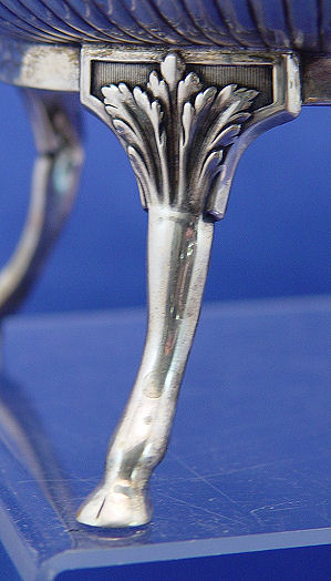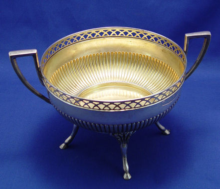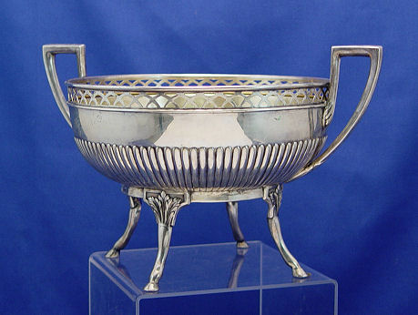 FINE GERMAN 800 SILVER HOOF FOOTED BOWL: Neoclassical style bowl with reticulated rim, ribbed body, raised on four legs in the form of a leg and hoof. Hallmarked with the crescent moon and crown- 800 and the retailer M.T. Wetzlar, Munchen (Munich). 8 1/4'' dia. 6 15/16''h. Approx. 16.11 oz.