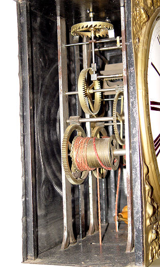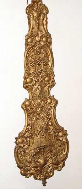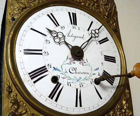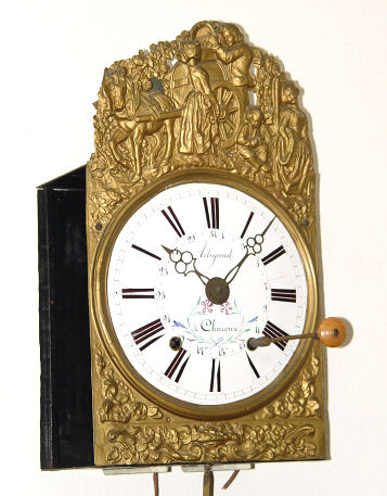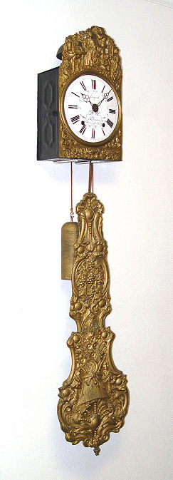 FRENCH MORBIER CLOCK: Weight driven, bell strike movement. Enameled dial hand painted in subtle floral design. The embossed metal is in a grape harvest motif. The dial is 9 1/2''. The clock is 61''h from top to bottom of pendulum.
