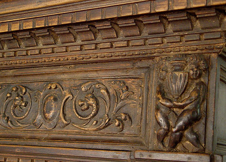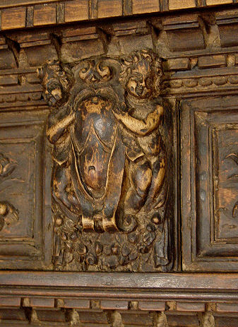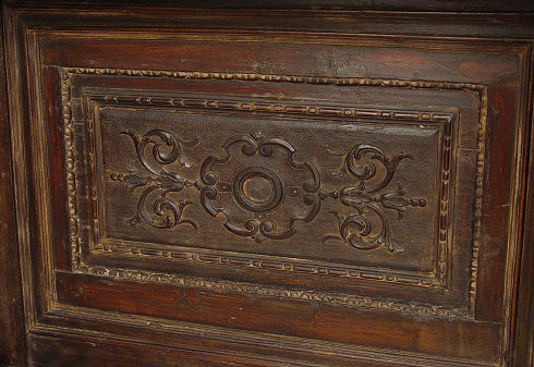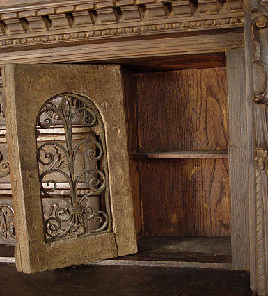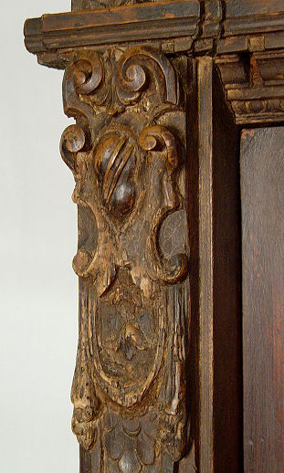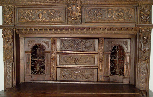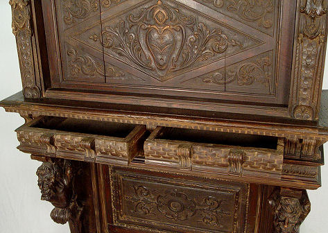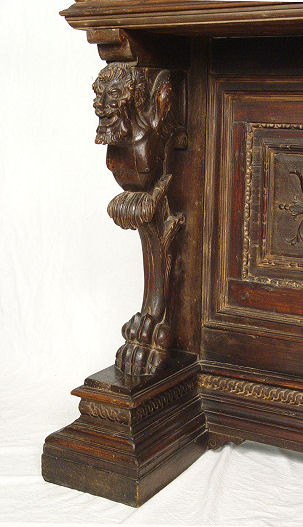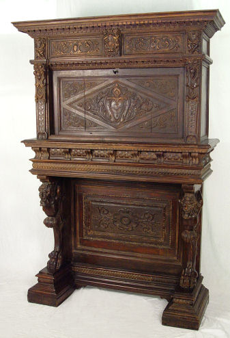 18th C CARVED ITALIAN CABINET ON STAND: In Spain it is known as a Vargueno. Fall front cabinet desk. The interior has original iron grill work and pulls and carved masqueron drawer fronts. The stand supports are carved figures with paw feet. 75''h. x 52'' x18'' overall. Est. $4000/6000**