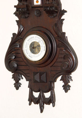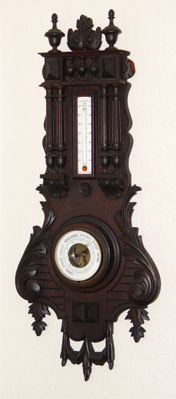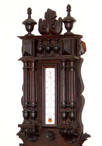 CARVED VICTORIAN THERMOMETER / BAROMETER: Lovely dark finish to this piece with many applied decorations. Centigrade thermometer chart (no thermometer) between double columns over the barometer raised on graduated circles. Approx. 29''h x 12''w