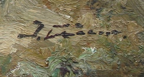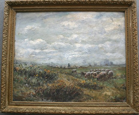 GOOD EARLY IMPRESSIONIST PAINTING OF SHEPHERD AND FLOCK: O/B, 19 1/2'' x 23 3/4'', illegibly signed lower right, encased in an overpainted gilt frame with missing gesso and wear, 23 1/2'' x 27 3/4''.