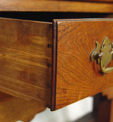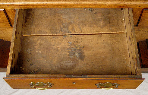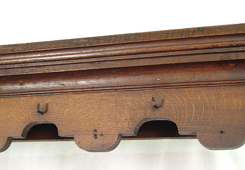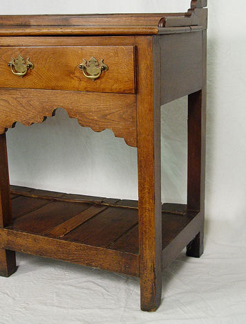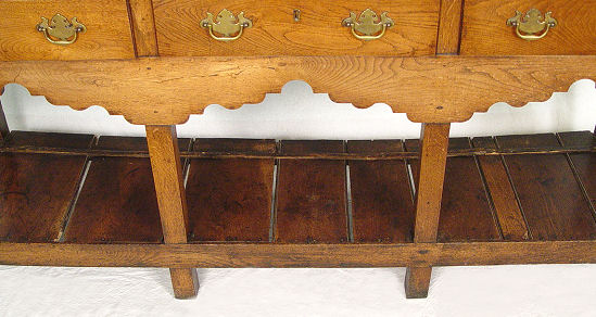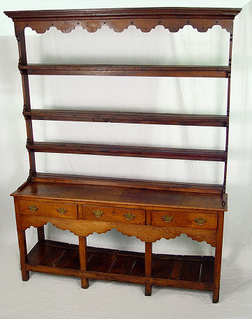 GEORGE III WELSH DRESSER: Ca 178O. Two part open cupboard. The top section with plate grooves, lower section with drawers. Approx. 85''h. x 65 1/2'' x 17'' deep. The upper shelves are 5'' deep.