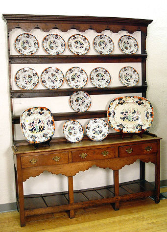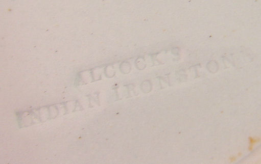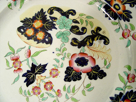 STAFFORDSHIRE INDIAN IRONSTONE 12 PLATES AND 2 PLATTERS: J & G Alcock, 1839- 1846. Polychrome flow blue ironstone set to include 12 plates, 10 1/2'' dia. The largest platter is 21'' x 17'' (has old repairs). The other large platter is 18 1/2'' x 15''.