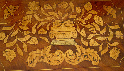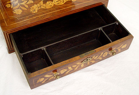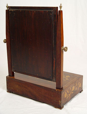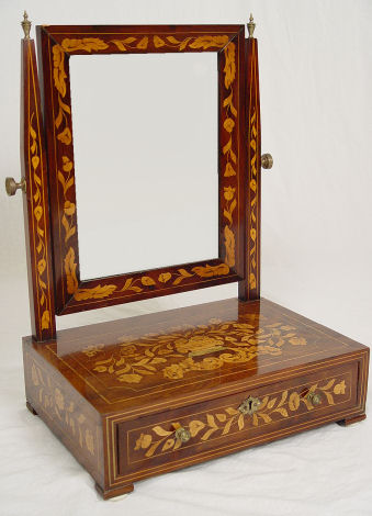 DUTCH MARQUETRY DRESSING MIRROR: Original looking glass supported between straight arms capped with brass finials. Single drawer with divided interior. Minute veneer loss, the glass does show its age. Overall in good condition. 24''h. x 17'' x 12''.