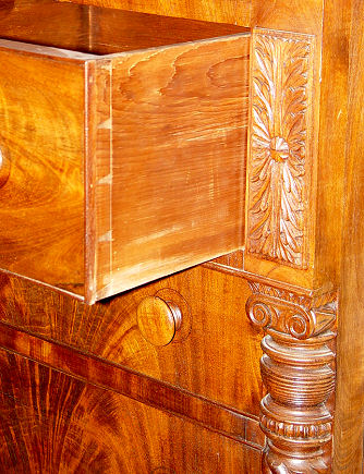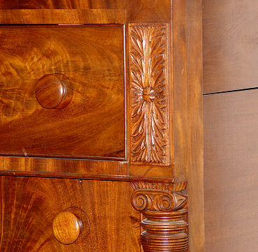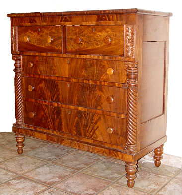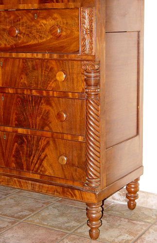 FLAME GRAIN MAHOGANY CHEST attrib. to JOHN McINTYRE OF MASS: Overhanging upper drawers, with all six drawers framed in molding, as the top. Spiral turned column stiles. Please note age separation in the top, overall very good condition. c 46 ¼''h x 46½'' w x 21''d.