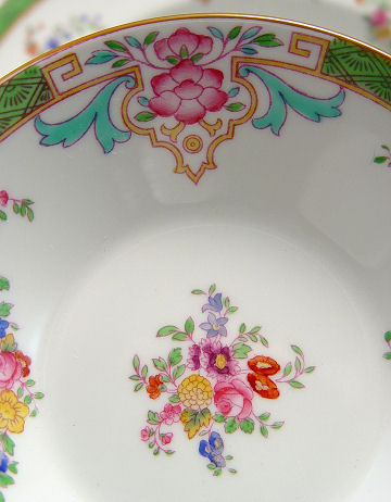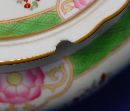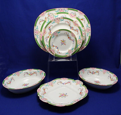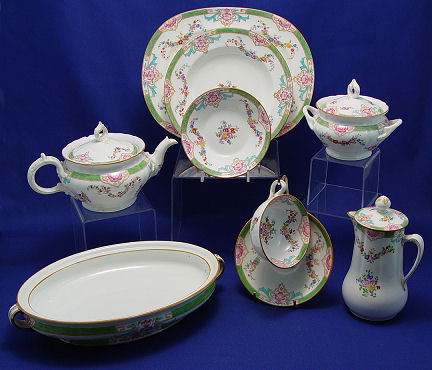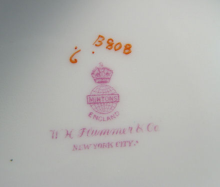MINTON FINE CHINA SERVICE CA. 1800'S: Pattern B808, this set was retailed thru W.H. Plummer & Co, New York. 60 pieces to include 9 dinner plates (10 1/4''), 8 luncheon plates, 8 bread plates, 10 dessert bowls, 9 soup bowls, 8 cups and saucers, (2 extra saucers), a square serving plate, 2 open oval vegetable bowls (9 1/4 & 10''), 2 platters (10 3/4 & 13'') a vegetable with handles (no lid), milk pitcher with lid, teapot (chip), and a covered sugar bowl (chip). The Minton cypher mark on several pieces is 1872 or 1882, they are very similar.