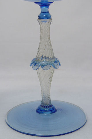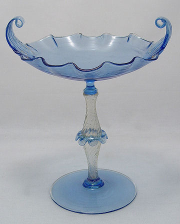 OUTSTANDING VENETIAN GLASS COMPOTE: Spiral stem speckled with gold, finely curled handles, 10''h.
