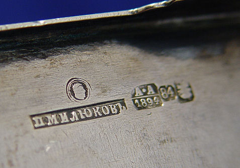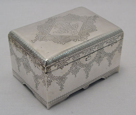 PETER MILYUKOV 1894 RUSSIAN SILVER TEA CADDY: Lidded silver box with etched design centered by stylized monogram and Roman numerals XXV. Marks indicate Moskow (Moscow) 1894 assayer Anatolí Apollonovich Artsibashev, maker name translated as P. Milukov, 3''h x 4 3/4''w x 3 1/4''. Approx. 11.54 oz.