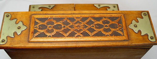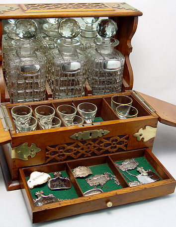 GOLDEN OAK TANTALUS WITH THREE DECANTERS AND CRIBBAGE BOARD: Pair of leaves lift to expose storage for shot tumblers (included). The bottom drawer is divided for game supplies, it presently holds a parquetry cribbage board and bottle labels. There are 3 sterling labels and 7 silver plated labels. Please note the bottle stoppers have chips as do two bottles. The oak case itself is in overall in very god condition. 13''h. x 14'' x 10 1/2''.