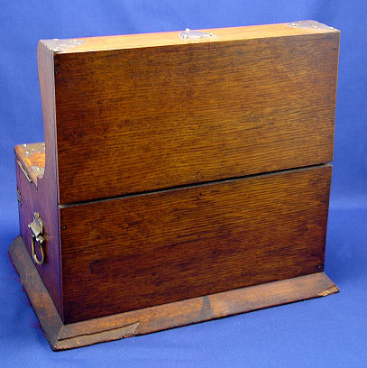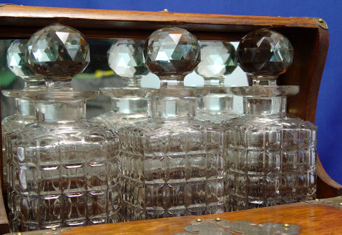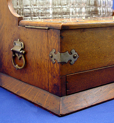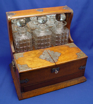 ENGLISH GOLDEN OAK TANTALUS WITH THREE DECANTERS: Pair of leaves lift to expose divided interior. Release mechanism for bottom drawer which is divided for game supplies. Please call for condition. 13''h. x 11'' x 14 1/2''