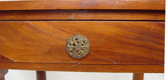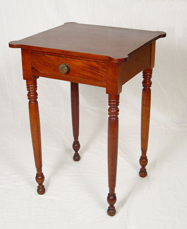 WALNUT ONE DRAWER WORK STAND: Cookie corners, turned legs. Chamfered drawer. Approx. 27''h. x 19'' x20''.