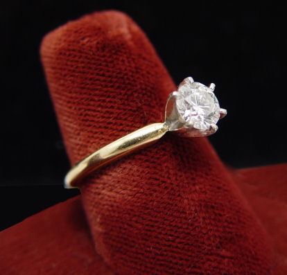 90PT DIAMOND SOLITAIRE ENGAGEMENT RING: Round brilliant diamond of approx. 90pts, measuring 6.1 x 6.1 x 3.9mm, purported H SI1, set in 14k yellow gold Tiffany style mount, size 7.25, 2.9 grams. Est. $1600/1800**