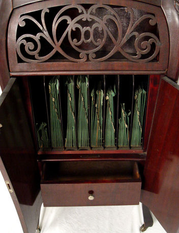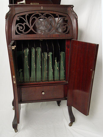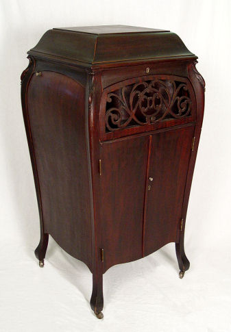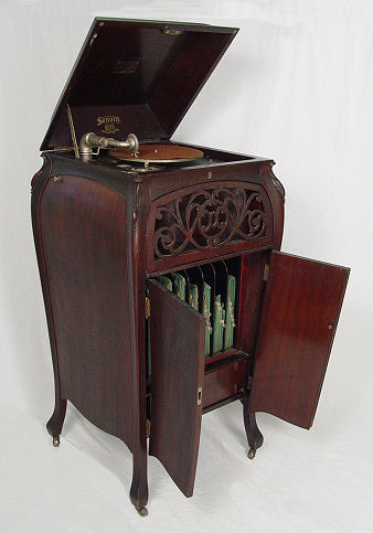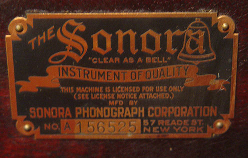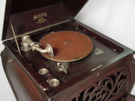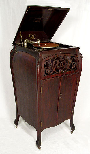 SONORA BABY GRAND PHONOGRAPH CA 1910-1915: Lift top floor standing. No. A156525 in working order. All original ribbon mahogany Bombe cabinet with pierced grill. Metal ID plates and decals are in place. Approx. 47 1/2''h. x 23''.