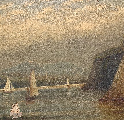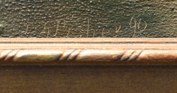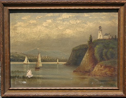 FISHER, D.A., (American, 19th/20th C): ''Four Mile Point, Hudson River'', O/B, 8 3/4'' x 11 3/4'', signed lower right and dated '90, encased in vintage frame, 10 1/4'' x 13 3/4''. Fisher is a noted White Mountain School artist. Condition - Needs cleaning, large abrasion with missing paint lower left corner, needs patch, several other scattered paint flecks, will clean up nicely.
