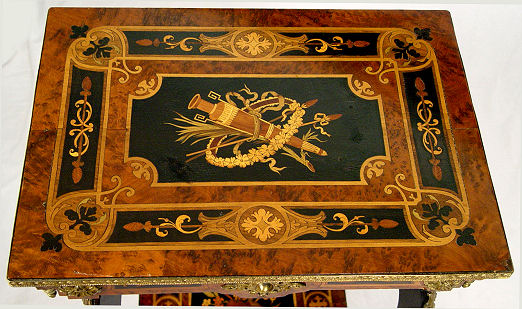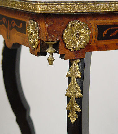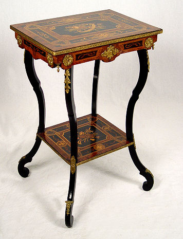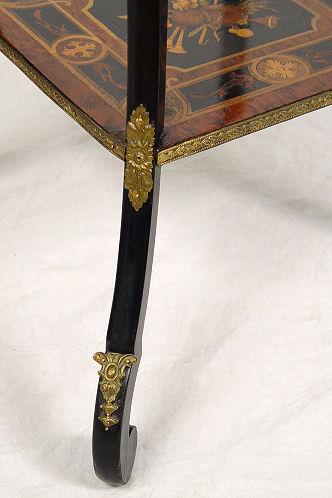 19TH C ITALIAN INLAID ORMOLU TABLE: Two tier table with gilt metal mounts and gilt wood medallions. Gently curved legs continue into scroll feet. 30 ½''h x 19 ½'' x 14''.