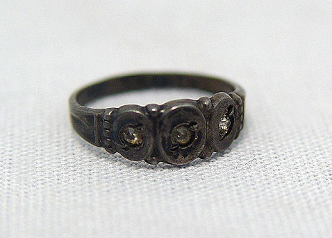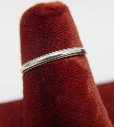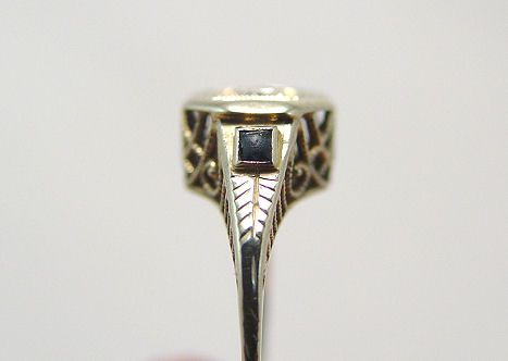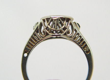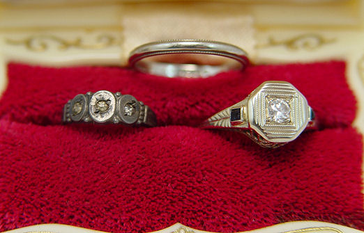 SMALL ESTATE LOT OF JEWELRY: To include, 18k white gold filigree ring set with an approx. 12pt round brilliant cut diamond, shoulders set with tiny square cut sapphires in poor condition, size 4 3/4. 18k white gold lady's wedding band, size 5. And an adorable sterling baby ring set with three tiny clear crystals, size zero? too small for my ring sizer. Three rings sold as a lot.