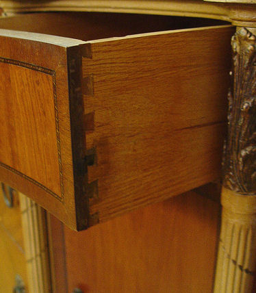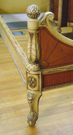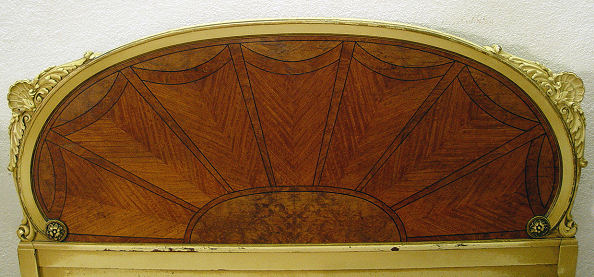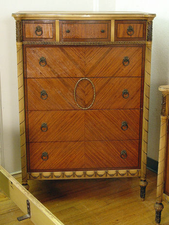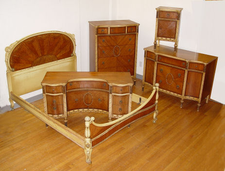 1920'S 4 PIECE FRENCH STYLE BEDROOM SET: FULL BED with rails, headboard is 50''h, TALL CHEST, 52''h. x 36'' x 21'', dresser, 36''h. x 50''w. 23'', a VANITY, and NIGHTSTAND. Original painted and walnut veneer finish is in shabby chic condition.